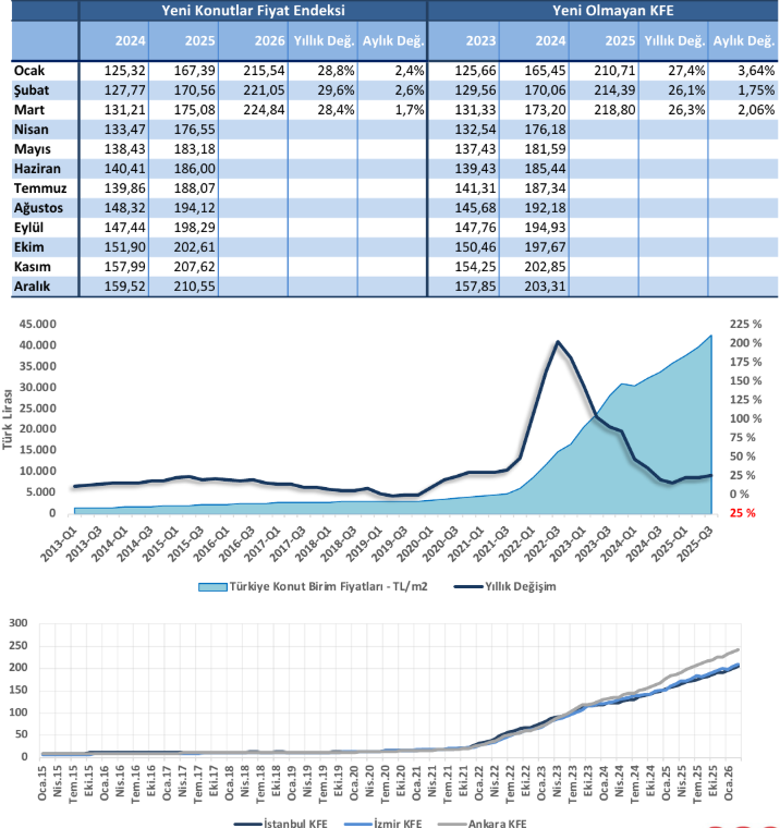 Yeni konutlarda fiyat artışının daha yüksek seyrettiği belirtilen rapora göre, Yeni Konutlar Fiyat Endeksi yıllık yüzde 28,4 artışla 224,8 seviyesine yükselirken, yeni olmayan konutlarda bu oran yüzde 26,3 olarak gerçekleşti.