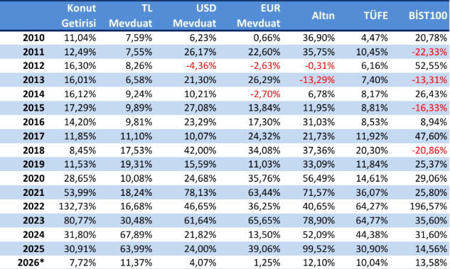 Uzun vadeli yatırım araçlarının karşılaştırıldığı analizde, 2010-2026 Mart döneminde en yüksek getirinin yüzde 12767 ile altın yatırımında elde edildiği, konutun ise kira getirisi ve fiyat artışları dahil yüzde 5393 ile ikinci sırada yer aldığı ifade edildi. Aynı dönemde dolar, euro ve BIST100 endeksinin de yüksek getiriler sunduğu, TL mevduatın ise görece daha düşük performans gösterdiği kaydedildi.