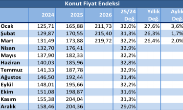 Türkiye Cumhuriyet Merkez Bankası verilerine dayandırılan rapora göre, Konut Fiyat Endeksi Mart ayında bir önceki aya göre yüzde 2,0 artarken, yıllık bazda yüzde 26,4 yükselerek 219,72 seviyesine ulaştı.