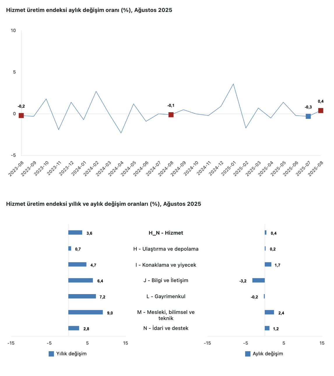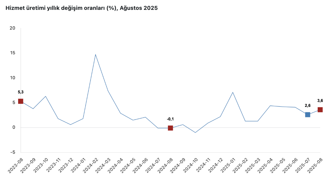 Hizmet üretim endeksi (2021=100) 2025 yılı Ağustos ayında bir önceki aya göre yüzde 0,4 arttı. Aynı ayda ulaştırma ve depolama hizmetleri yüzde 0,2 arttı, konaklama ve yiyecek hizmetleri yüzde 1,7 arttı, bilgi ve iletişim hizmetleri yüzde 3,2 azaldı, gayrimenkul hizmetleri yüzde 0,2 azaldı, mesleki, bilimsel ve teknik hizmetler yüzde 2,4 arttı, idari ve destek hizmetleri ise yüzde 1,2 arttı.